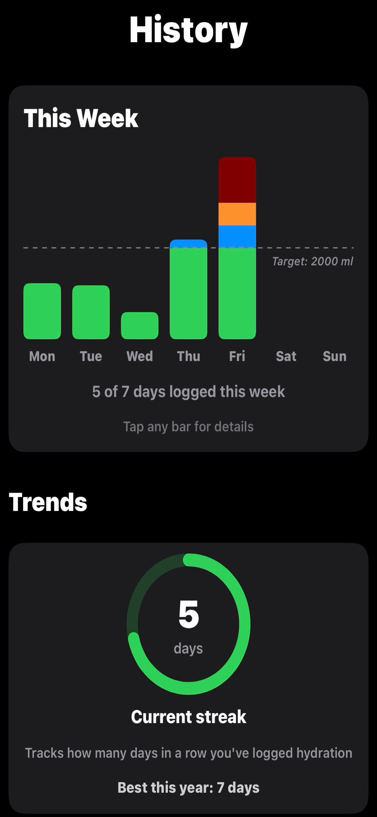 A free, privacy-first hydration tracker for iPhone.No ads, no subscriptions, no data collection - just a clean, easy way to track your water intake and hit your daily goals.